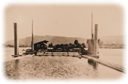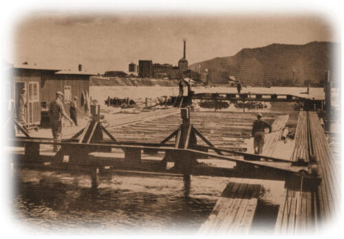 nedover elva. Skurtømmer til sagbrukene var sortert ut